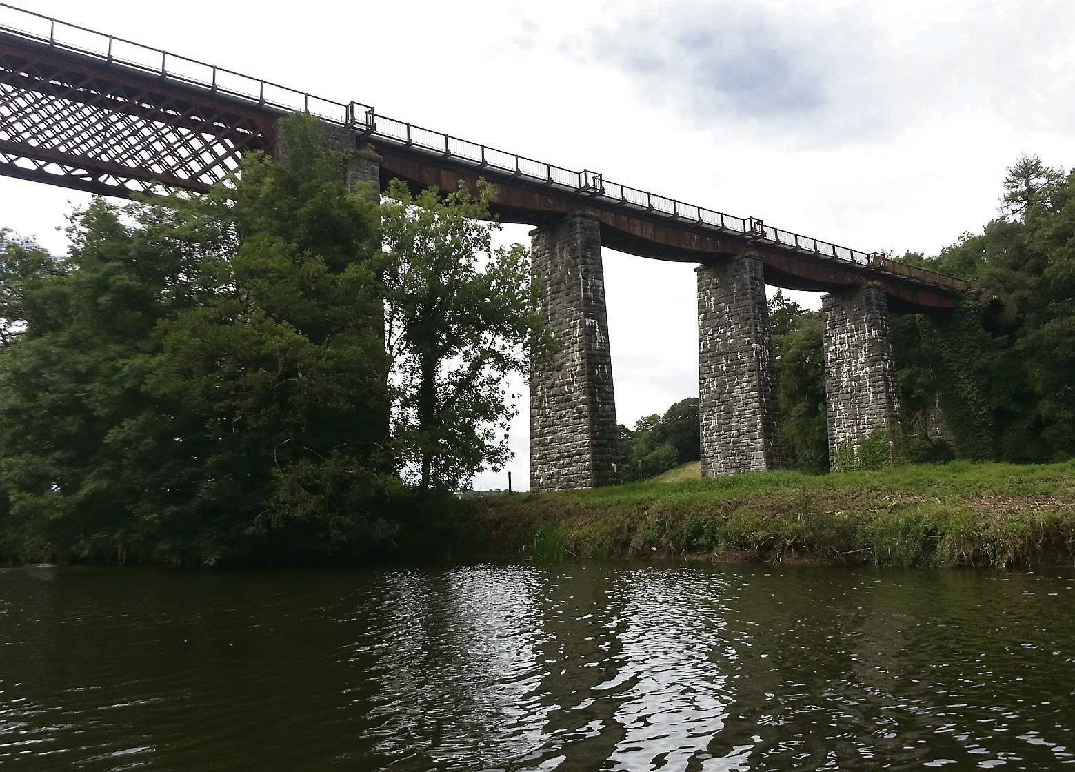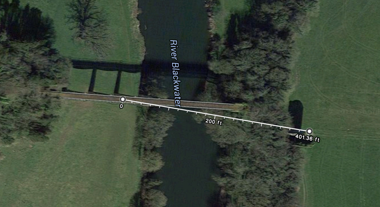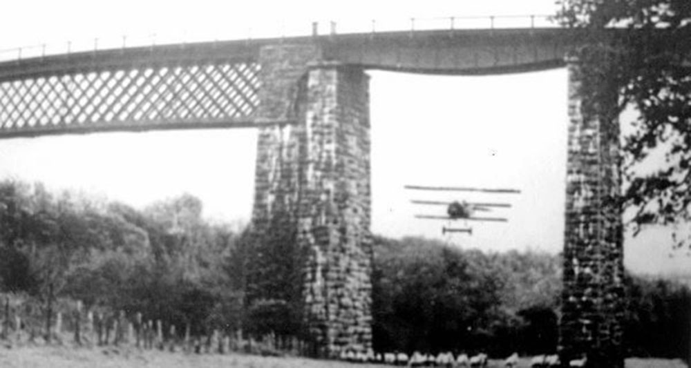 Filming the scene at 07:30, in which von Klugermann in his D.VII “buzzes” Stachel on his first visit to the aerodrome. Director Guillermin in cap. Film loader John Earnshaw in glasses. See also this even lower pass. The pilots weren’t the only crew members risking their lives. As a Fokker hopped a tree row, leveled off and rushed the camera, film loader John Earnshaw noticed that he was actually looking down on its wheels. He hit the dirt just before one of them ripped the camera motor out of his hand. Camera operator Chic Waterson was struck on the head, but back at work the next day. Director of photography Douglas Slocombe was hospitalized for three weeks with a wrenched back. 20th Century Fox head of European production and Blue Max executive producer Elmo Williams admitted Guillermin was “indifferent to people getting hurt as long as he got realistic action...a hard-working, overly critical man whom the crew disliked.” And the idea of a bridge fly-through followed by a crash wouldn’t go away. “Where and exactly why the crash was to occur was not yet determined,” recalled Piggott, “because so much would depend on the location used.” At Carrigabrick, east of the village of Fermoy in County Cork, a railway viaduct of wrought-iron lattice girders spanned the Blackwater River on stone pillars. Carrigabrick Castle, the five-story stone keep at one end, was tall enough to snag a low-flying aircraft for a climactic crash. Garrison flew a test run, and Piggott was told the bridge “had been flown under by the pilots of the RAF in the 1930s,” but he flew down to judge for himself. Carrigabrick Viaduct