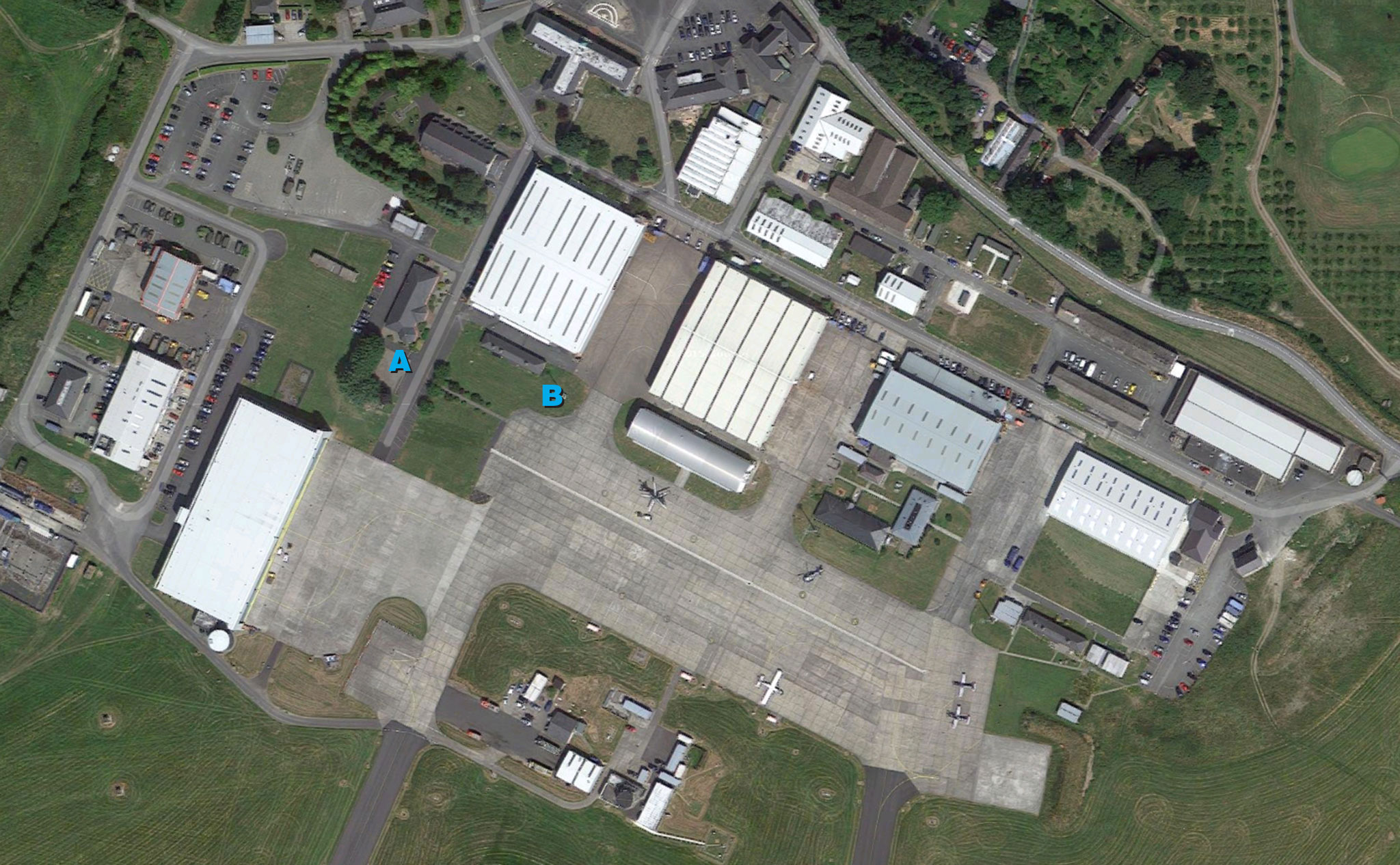 ![]() Casement Aerodrome (now Casement Airbase), about three and half miles southeast of Weston, has also been greatly improved since 1965. Much of what was grass then was already under concrete by 1982. The building in which the dramatic final scenes take place (A) and in which Stachel is detained while Heidemann flies the “Fokker D.VIII” (B) were both movie props, and dismantled when production was complete. The sites are now (A) an enclosure where an aircraft was displayed for a period some years ago and (B) a light pole. The building just above (A) (with vehicles parked behind it) is the present Casement VIP Terminal.