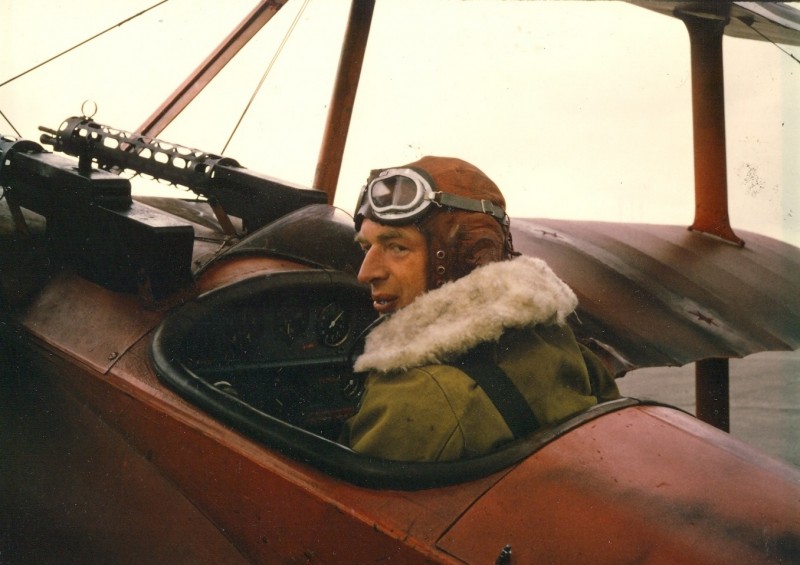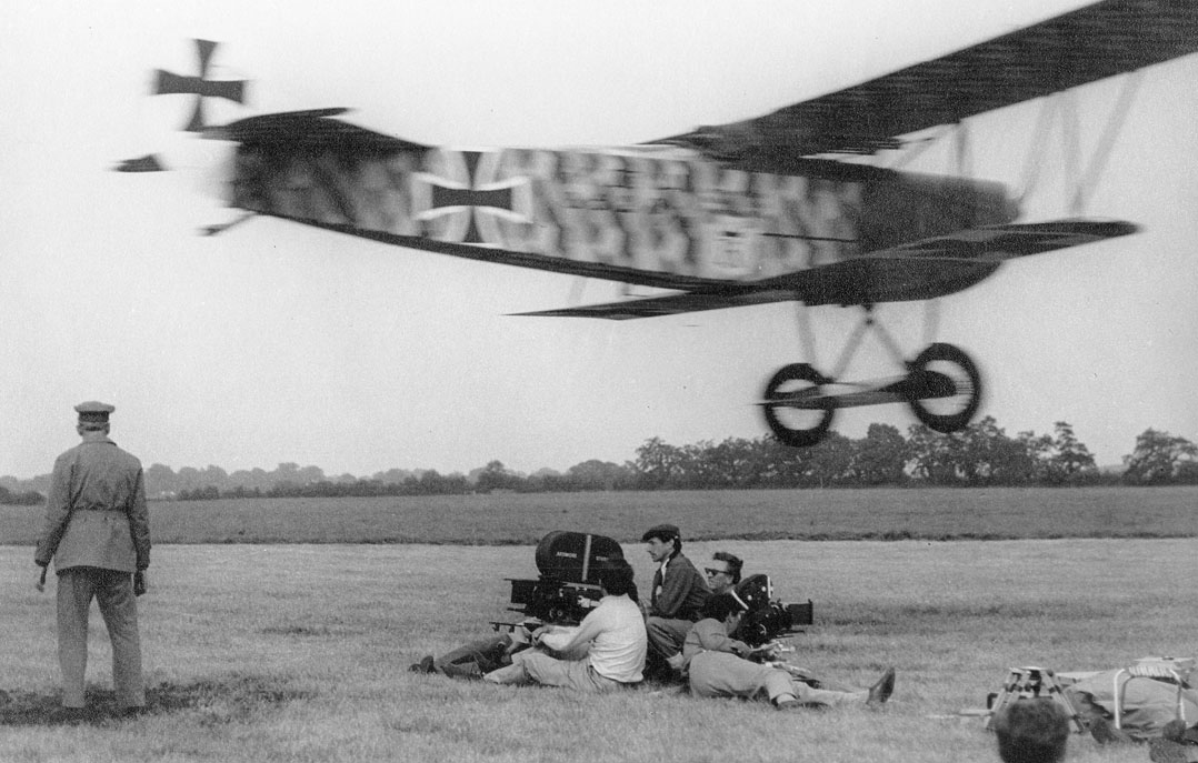 Derek Piggott in the cockpit of a Slingsby T53 glider in 1952, with Fred Slingsby (left) & designer J.L. Sellars. Slingsby actually served in the Royal Flying Corps in WWI as a gunner/observer. Once, when his pilot was killed, Slingsby climbed from his cockpit and into the pilot’s, took control of the aircraft and flew back to British lines.Arriving at Ardmore Studios, Dublin, Ireland, in 1965 to begin work on a new 20th Century Fox World War I dogfight movie, stunt pilot Derek Piggott learned he was in for more than just zooming around the skies, popping off smoke bombs and fake bullets while cameras rolled. The script called for a biplane to fly under a bridge, and producer Christian Ferry did not intend to use remote-control models. He meant to make the greatest WWI air combat film of all time: The Blue Max. “He must have had photos of almost every bridge in Ireland,” recalled Piggott, who had flown Airspeed Horsa gliders for the RAF in World War II, set a postwar glider altitude record (22,800 feet without oxygen) and broken into movies flying pre-WWI replicas in Those Magnificent Men in Their Flying Machines. “I often wonder now whether Christian showed all the pilots these photos in order to see their reaction, and to try to decide who he would ask to do the job when the time came. Perhaps I was the only pilot who did not say that all the bridges looked quite hopeless.” Not to mention that the stunt would have to be flown in an airplane virtually hand-built from scratch. Aircraft made of wood and cloth tend to rot, and five decades after the Great War the owners of the few surviving WWI warbirds weren’t inclined to risk them making movies. The Blue Max required Fox to assemble two miniature air forces, at the cost of about a quarter of a million dollars—in today's money, nearly $2 million.