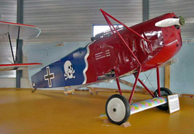 The third Blue Max Fokker D.VII, #N904AC, on display at the Southern Museum of Flight in Birmingham, Alabama, includes a mockup of the original Mercedes engine.