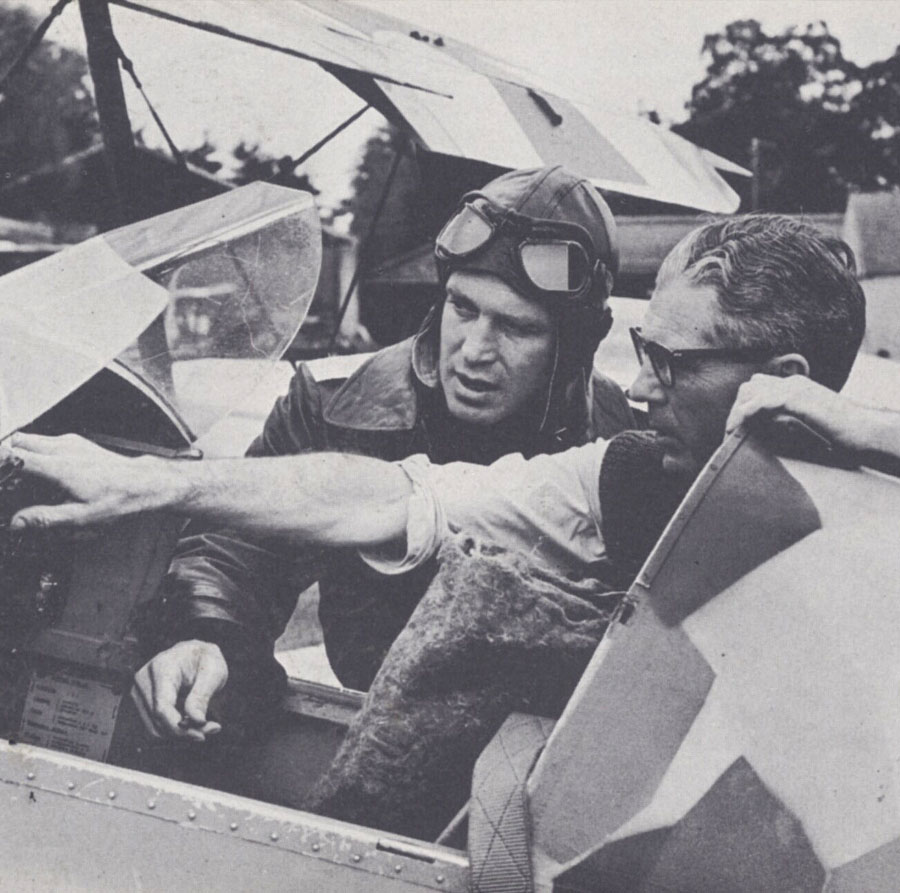 more...Star George Peppard took the role of Stachel so seriously that he actually learned to fly. “Before production on The Blue Max, I took an intensive four-month flying course, which gave me 210 hours on my pilot’s log, 130 of them solo,” he reported. “I then checked in at our location in Ireland and spent an additional month flying the re-creations of early aircraft built for the film.” He proved it on the cover of the May 1965 issue of Air Classics magazine, flying a Stampe in German colors. Anthony Squire, a WWII flying boat pilot who learned movie work with the RAF Film Unit, would direct the air action. German WWI pilot Kurt Delang, with two victories as a senior NCO in Jasta 10, served as technical adviser. Director John Guillermin, thus far best known for Tarzan movies, was determined to make the most of his big break. “Life isn’t really filled with many heroes,” he said of the story, or perhaps the pilots he asked to fly his planes, “but there are men like [main character] Bruno Stachel who strive to achieve greatness against such overwhelming odds that the attempt, to lesser men, must seem not only impossible but madness.” The crewStunt Pilot Derek Piggott gives flying instruction to star George Peppard on the set of The Blue Max. Peppard learned to fly for the role, and proved it on the cover of Air Classics magazine. Co-star Andress appears to have at least gone up for a ride. Stunt Pilot Charles Boddington, who flies the triplane barrel roll just before The Blue Max bridge scene. See also this view. In Sept. 1970 he was killed flying an SE.5 replica during the filming of Von Richthofen and Brown. Stunt Pilot Lynn Garrison, who later bought the entire “Blue Max” fleet, and was instrumental in keeping the red triplane alive. He made his money flying as a mercenary in Africa and Latin America.