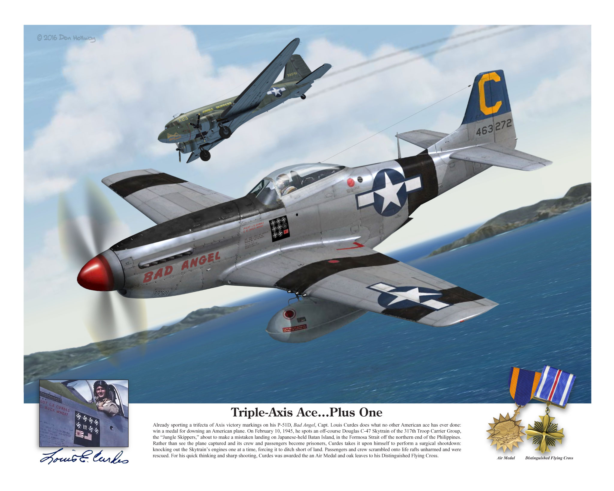 Already sporting a trifecta of Axis victory markings on his P-51D, Bad Angel, Capt. Louis Curdes does what no other American ace has ever done: win a medal for downing an American plane. On February 10, 1945, he spots an off-course Douglas C-47 Skytrain of 317th Troop Carrier Group, the “Jungle Skippers,” about to make a mistaken landing on Japanese-held Batan Island, in the Formosa Strait off the northern end of the Philippines. Rather than see the plane captured and its crew and passengers become prisoners, Curdes takes it upon himself to perform a surgical shootdown: knocking out the Skytrain's engines one at a time, forcing it to ditch short of land. Passengers and crew scrambled onto life rafts unharmed and were rescued. For his quick thinking and sharp shooting, Curdes was awarded the an Air Medal and oak leaves to his Distinguished Flying Cross.