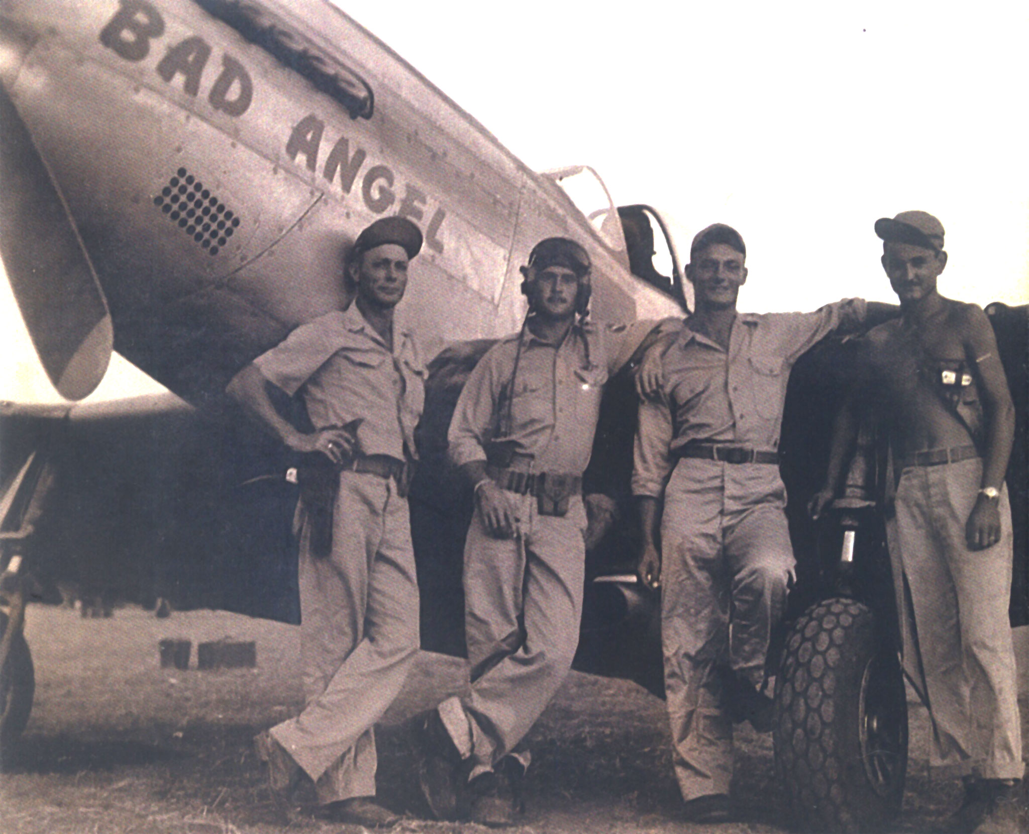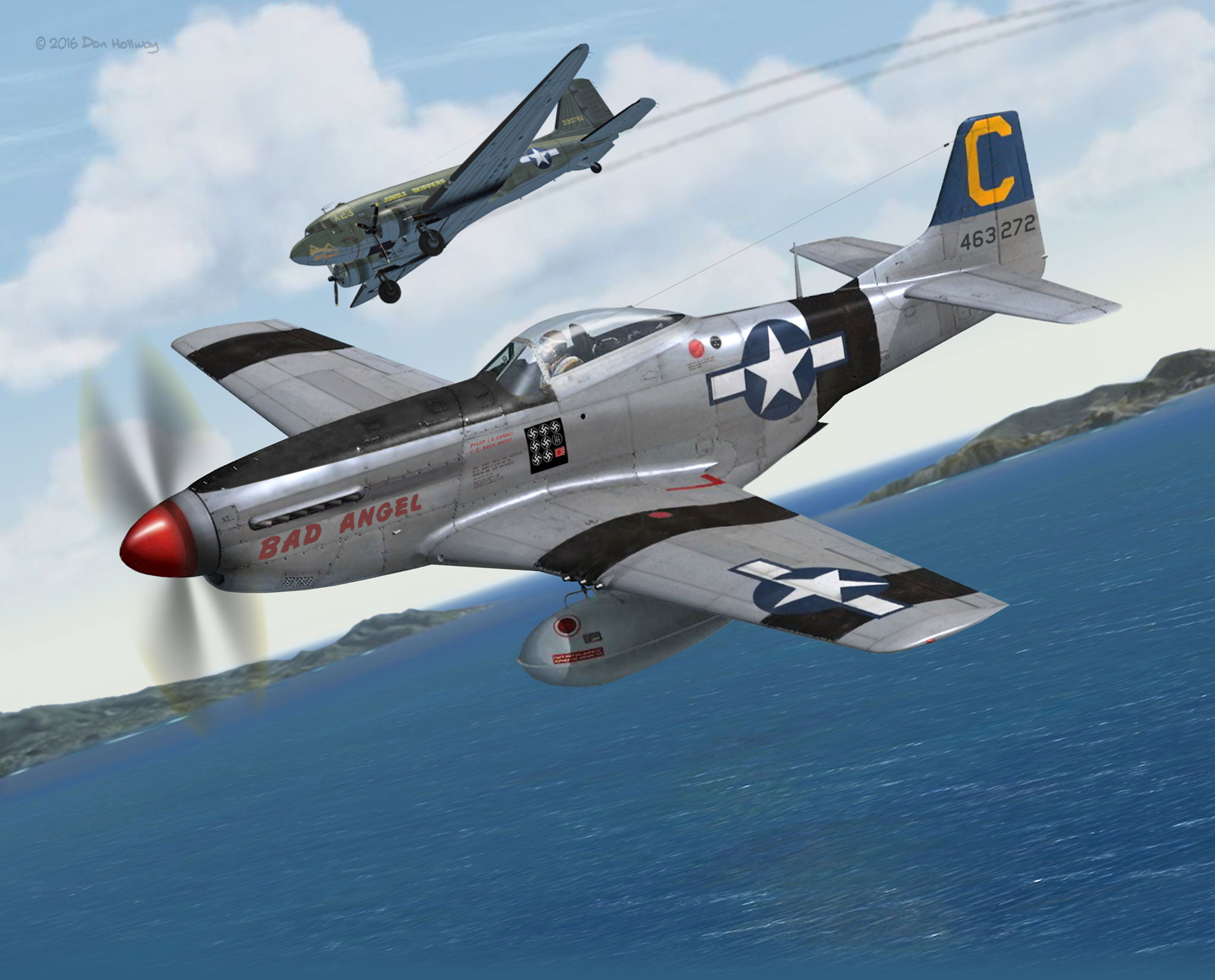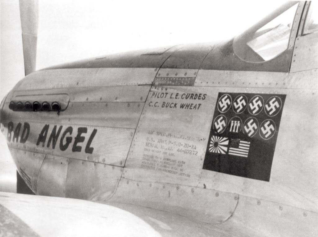 On January 6, 1945, American forces landed at Lingayen, the capital of Pangasinan Province, Philippines. The 3rd Air Commando Group, a mixed fighter/liaison/transport unit under the Fifth Air Force, moved into newly built Mangaldan Airfield. Consisting of six combat squadrons and four support units, including two fighter squadrons, three liaison squadrons and one transport squadron, the Commandos flew ground support missions, escorted bombers to Formosa and the Chinese coast, supported ground forces in the Philippines, and provided top cover for ship convoys. As part of 4th Fighter Squadron, Curdes flew P-51D/20-NA #44-63272, Bad Angel. Evenings, he and the other pilots dated nurses in Lingayen.