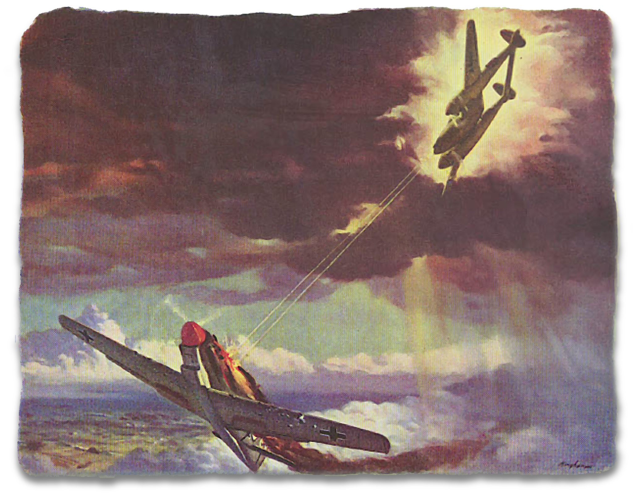 Separated from his flight, Curdes spotted three Germans chasing a Lightning just above the water. “They evidently didn't see me, and I gave the right-hand plane a big burst. This '109 was lagging a bit behind the other two, which were in a very tight formation. My tracers went into him, puffs of black and white smoke came out and he did a wingover straight in.”