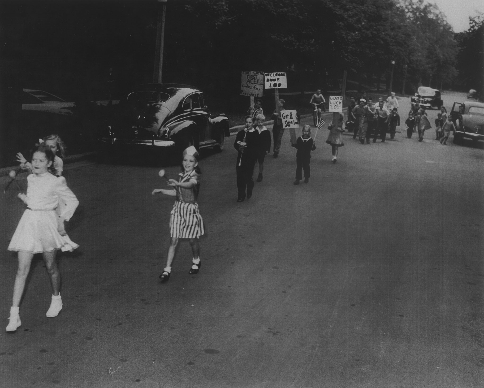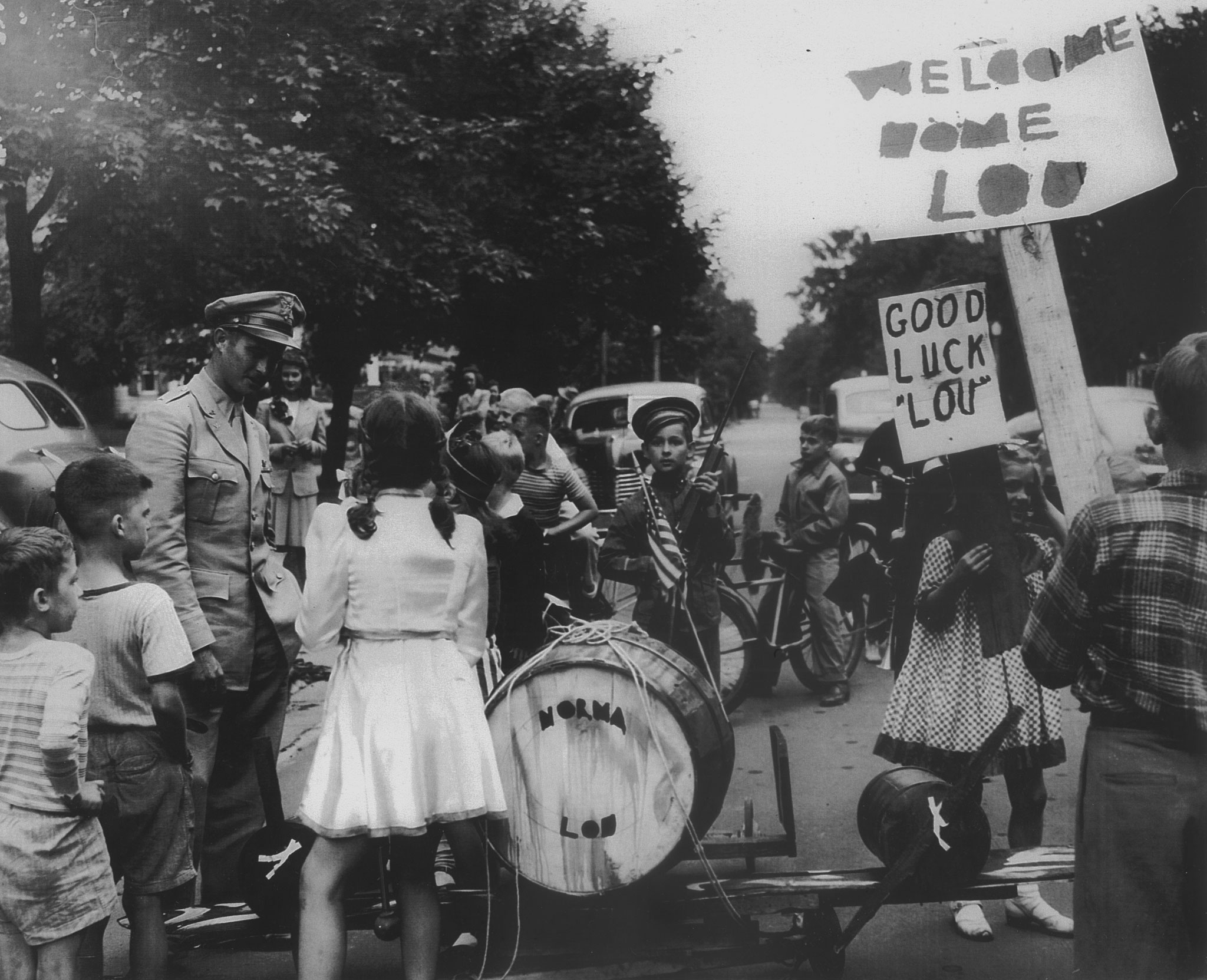 Ft. Wayne was unable to stage an official parade for the hero’s homecoming, but neighborhood children pulled him down Florida Drive in a makeshift Lightning with cheese-box engines and a fuselage made out of a barrel. More.