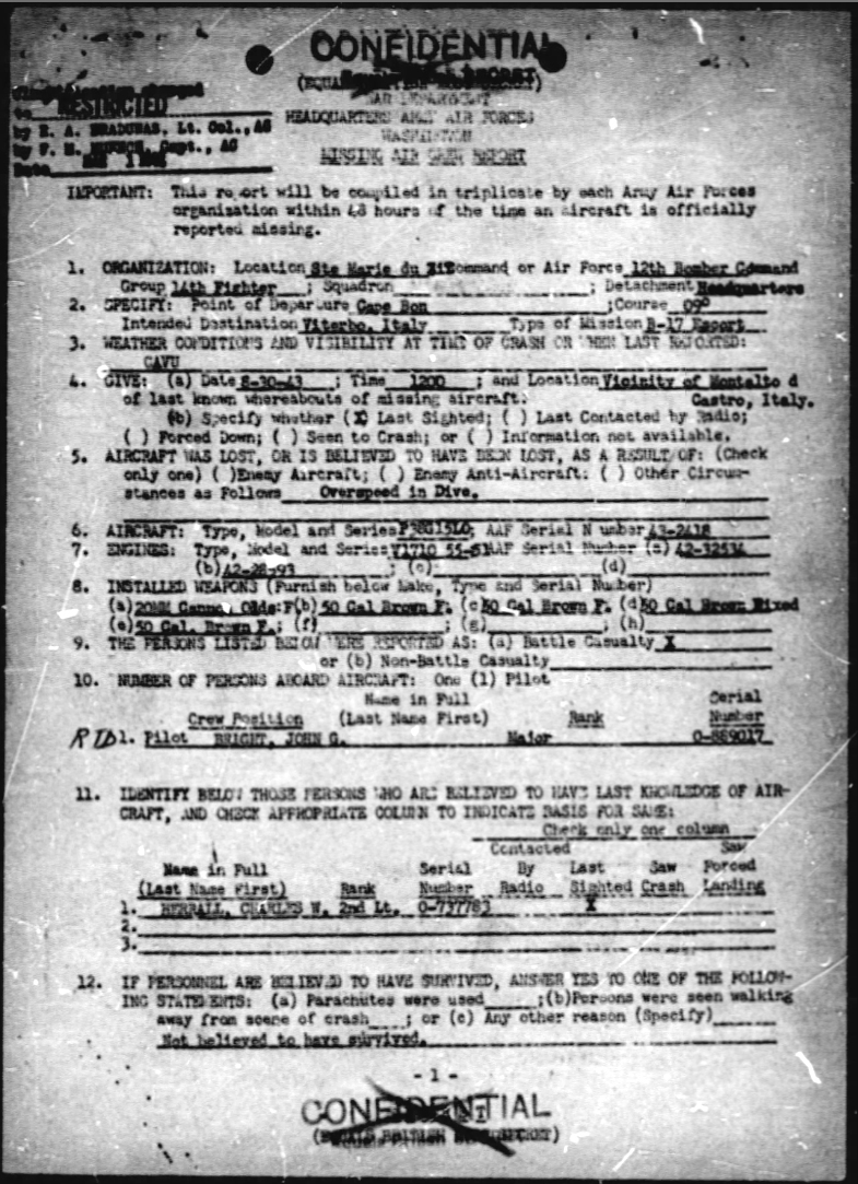 After that Bright's career parallels Louis Curdes’. At noon on August 30 the ex-P-40 pilot overspeeded his P-38G-15-LO #43-2418 in a dive over Montalto di Castro. (The P-38 was notorious for losing its tail in high-speed dives.) Captured by Italians in September, Bright was held prisoner for ten days until the Armistice, then had to travel over 100 miles through German-held territory to reach friendly troops. Whether he and Curdes ever crossed paths on their journey is unknown.