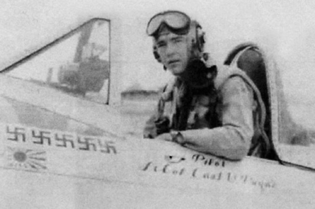 Lt. Col. Carl Payne in his P-47N fighter on the Ie Shime island, 1945. Interestingly, the victory markings below the windshield indicate five German and one Japanese plane shot down, but not his confirmed Italian kill.