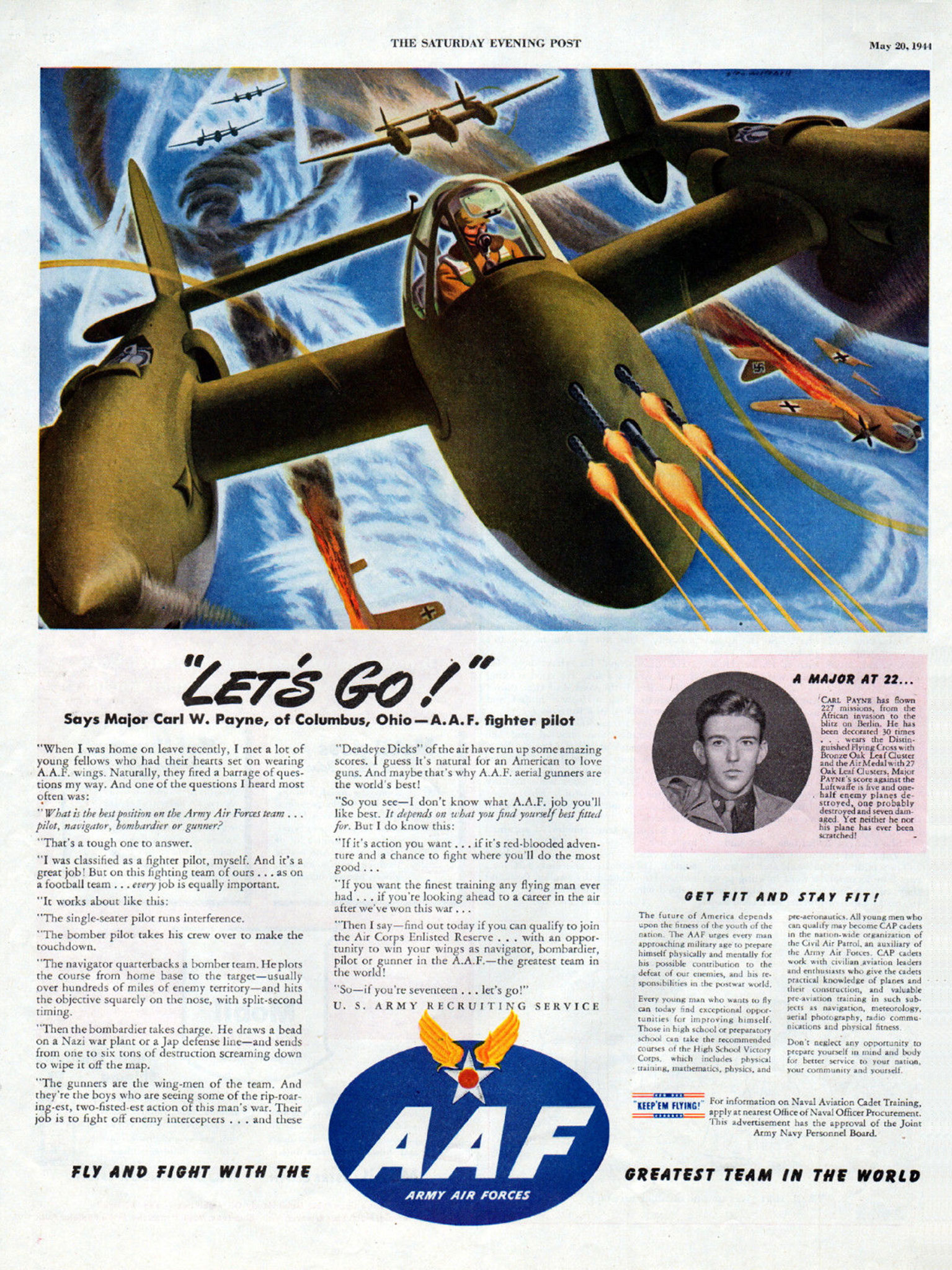 At the beginning of July the 309th flew top cover for the invasion of Sicily. The day after the landings Payne claimed an FW-190 (later assessed as an Me-109) to become an ace. Four days later he was given command of the 309th, but not long afterward he rotated home to take command of the 34th Fighter Squadron, 413th Fighter Group, flying the long-range Republic P-47N Thunderbolt. In the May 20, 1944 issue of the Saturday Evening Post, Major Payne was featured in an Army Air Force recruiting ad, his score given as “five and one half enemy planes destroyed, one probably destroyed and seven damaged. Yet neither he nor his plane has ever been scratched!” (Oddly, the ad also features a P-38 Lightning, a type Payne never flew.)
